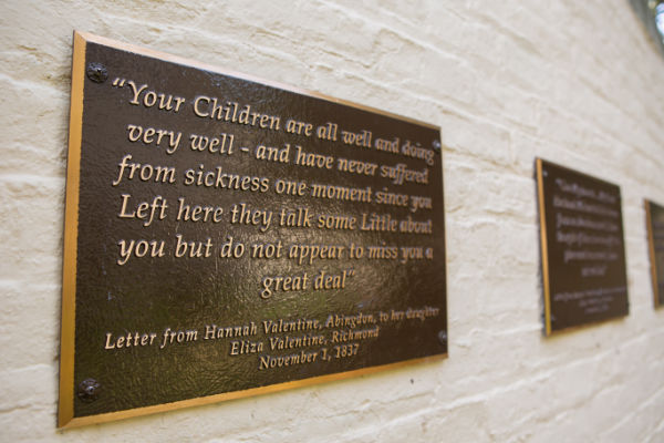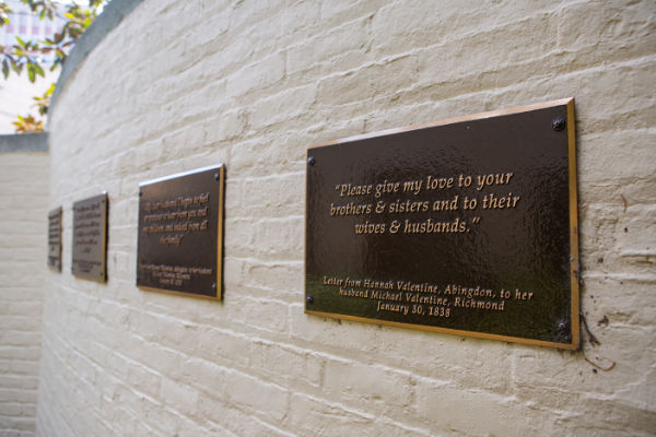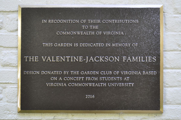Vườn tưởng niệm Valentine-Jackson tưởng nhớ cuộc đời của gia đình Valentine và Jackson bị bắt làm nô lệ, ghi nhận và tôn vinh những hy sinh và đóng góp của họ, cũng như của tất cả những người Mỹ gốc Phi bị bắt làm nô lệ, cho Virginia. Được đưa đến Richmond cùng với gia đình của Thống đốc David Campbell vào năm 1837, các thành viên của gia đình Valentine và Jackson đã trao đổi thư từ với gia đình họ vẫn đang sống và làm việc tại trang trại Campbell ở Abingdon, VA. Những trích đoạn từ những lá thư cảm động của họ được nêu bật dọc theo các bức tường của Vườn tưởng niệm Valentine-Jackson.